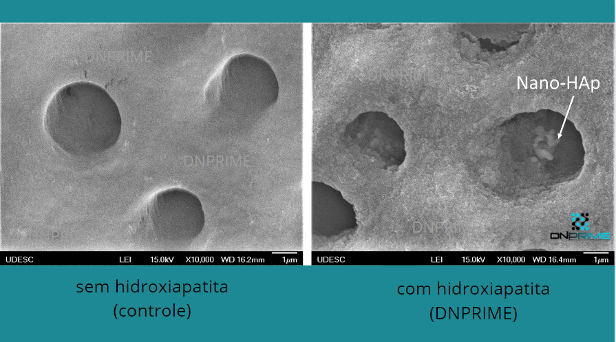 A imagem acima mostra ampliado a ação da nano-hidroxiapatita preenchendo os túbulos dentinários. Por ser a mesma composição do osso natural, a hap vai preenchendo e criando nova camada apatita nos dentes, remineralizando e protegendo.
